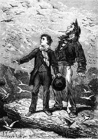 – Efektive – respondis Harbert. – Ĉi tiuj estas kolomboj, sed sovaĝaj, nomataj rokaj kolomboj. Mi rekonas ilin per la duobla nigra strio sur la flugiloj, la blanka vosto kaj la blugriza plumaro. Kaj ĉar la rokkolombo mem estas tre bongusta, do ĝiaj ovoj ankaŭ devas esti bongustaj; kaj mi vetus, ke ni trovos sufiĉe da ili en la nestoj.