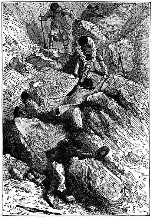 Tiuj ĉi bestoj staris senmove inter la bazaltaj fragmentoj kaj rigardis kun miro, kvazaŭ ili unuafoje vidus dukrurajn estaĵojn, poste ili subite ektimis kaj, saltante sur la rokojn, malaperis inter la krutaĵoj.