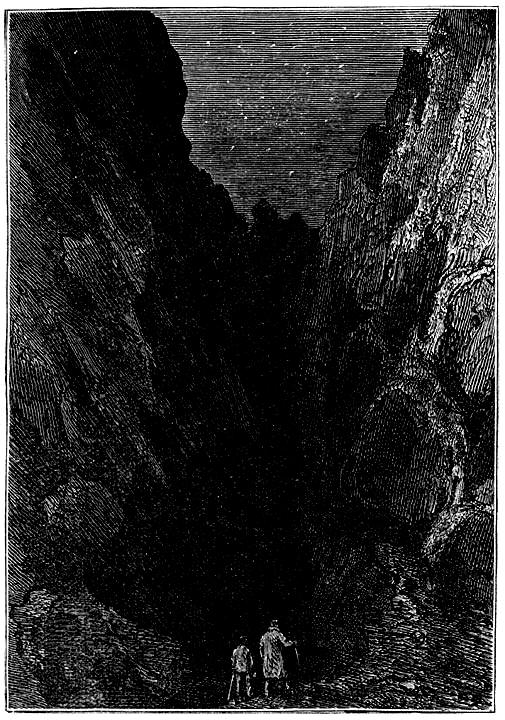 Per unu rigardo Cyrus Smith taksis ĉi tiun eblecon, kaj senhezite eĉ por momento, li kaj Harbert eniĝis en la profundon de ĉi tiu enorma fendego, meze de la ĉiam pli profundiĝanta mallumo. La pinto de la konuso leviĝis mil futojn super iliaj kapoj.