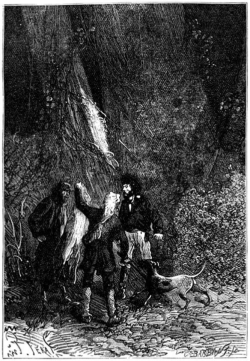 Sed tuj kiam ili stariĝis, subite aŭdiĝis laŭta bojado de Top, kaj post momento la hundo elkuris el la arbaro, tenante en la buŝo pecon da ŝtofo trempita en koto.
