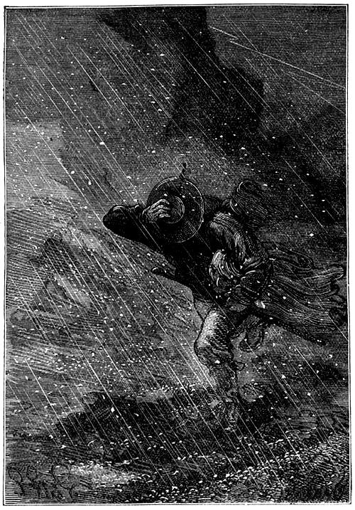 La ŝtormo daŭris ok tagojn, kaj dum tiu tempo tondroj sonis konstante. Inter la unua kaj la dua ŝtormoj, ilia obtuza muĝado aŭdiĝis ĉe la randoj de la horizonto. La ĉielo lumiĝis per fulmaj strioj de tempo al tempo, kaj la fulmoj faligis kelkajn arbojn sur la insulo. Du aŭ trifoje fulmo trafis la marbordan sablon kaj fandis ĝin en vitromason. Tiu ĉi vidaĵo pensigis la inĝenieron, ke eble eblus instali dikajn kaj daŭrajn vitrojn en la fenestroj de la Palaco, kapablajn elteni la batojn de vento, pluvo kaj hajlo.
