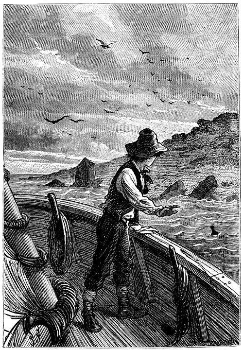 Duonmejlon for de la bordo, la vento, retenata de la monteto, preskaŭ estingiĝis, kaj la ŝipo naĝis iom malrapide. Harbert staris ĉe la pruo kaj montris la vojon inter la mallarĝejoj, kiam li subite turnis sin kaj kriis: