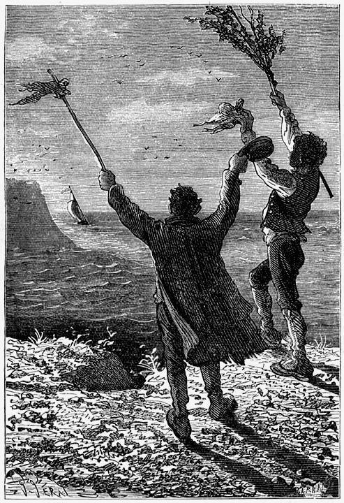 La Bonaventuro jam malproksimiĝis kvaronmejlon de la bordo, kiam ĝiaj pasaĝeroj vidis du virojn sur la Granita Palaco donanatajn al ili adiaŭsignojn. Tiuj estis Cyrus Smith kaj Nab. Por la unua fojo, la amikoj disiĝis.