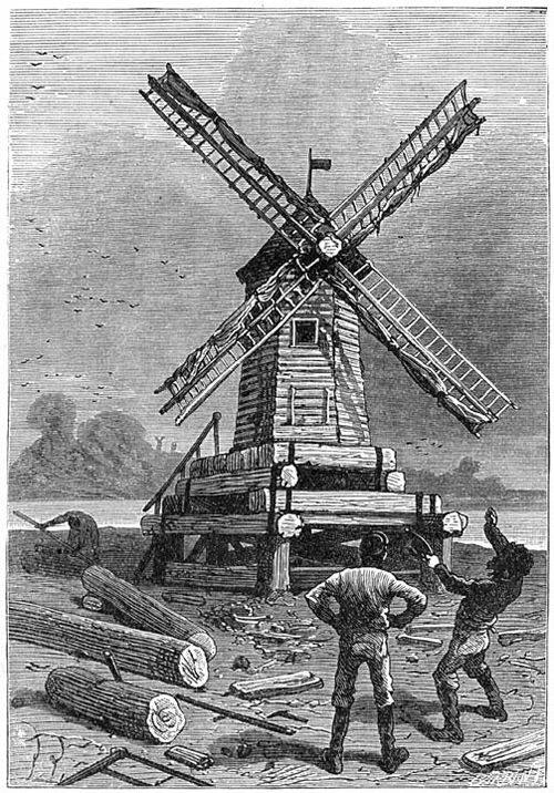 Do laboro komenciĝis tuj kaj oni elektis la necesan konstrumaterialon, kaj por la ekstera kaĝo de la muelejo kaj por ĝia interno. Kelkaj grandaj ŝtonegoj trovitaj sur la norda bordo de la lago lasis sin facile transformi en muelŝtonojn, kaj koncerne la flugilojn, la neelĉerpebla balonŝelo disponigis la necesan tolon.