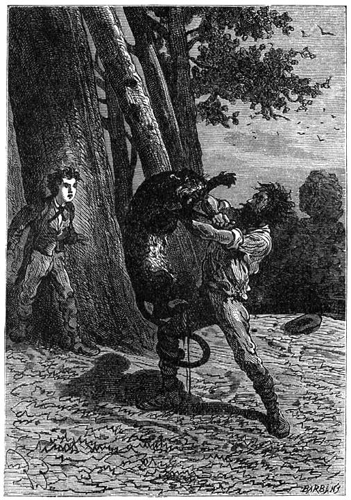 Tie, Harbert staris vizaĝ-al-vizaĝe kun grandega jaguaro, simila al tiu, kiu estis mortigita ĉe la Promontoro de Lacerto. Surprizita Harbert provis kaŝi sin malantaŭ arbo, dum la besto, kaŭrinte sur la teron, jam prepariĝis por salti... Sed en tiu momento, la fremdulo, ne havante alian armilon krom tranĉilo, ĵetis sin al la predanto, kiu tuj kontraŭatakis la novan agresanton.