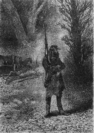 Post abunda vespermanĝo, al kiu ili sidiĝis kun granda apetito, oni prenis taŭgajn antaŭzorgojn por la nokto. Se la inĝeniero nur havus aferon kun sovaĝaj bestoj, li simple ordonus ekbruligi fajrojn ĉirkaŭ la bivakejo kaj tio sufiĉus por defendo; sed la brilo de flamoj prefere altirus la piratojn ol deteni ilin, do ŝajnis pli konsilinde resti en la mallumo. Ili ankaŭ ne forgesis organizi gardiston. Du setlantoj gardis kune, kaj post ĉiuj du horoj iliaj aliaj kunuloj devis anstataŭigi ilin. Ĉar, malgraŭ ardaj protestoj de Harbert, li estis forigita de la gardado, do Pencroff kaj Gideon Spilett, kaj sekve la inĝeniero kaj Nab, laŭvice staris garde apud la bivakejo.