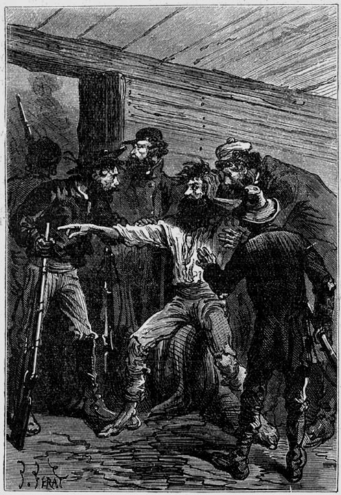 Malgraŭ ĉi tiuj pripensoj, la incitita Pencroff, vidante antaŭ si la gregejon, kie, li supozis, la rabistoj kaŝas sin, estis jam saltonta antaŭen, kiam la forta mano de la raportisto tenis lin surloke.