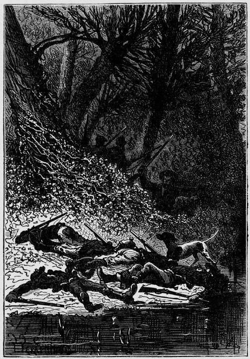 Ĉi tie ili haltis. Kelkaj lastaj sunradioj ankoraŭ lumigis la maldensejon senigitan je arboj. Tridek paŝojn antaŭ ili, nigriĝis la pordego de gregejo, ŝajne fermita. Tiuj tridek ŝtupoj apartigantaj la maldensejon de la barilo estis danĝera zono. Kaj efektive, unu aŭ kelkaj kugloj, senditaj de la supro de la palisaĵo, povus mortigi ĉiun kiu paŝus en tiun ĉi liberan spacon.