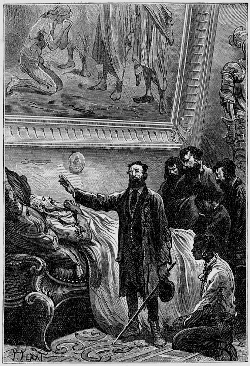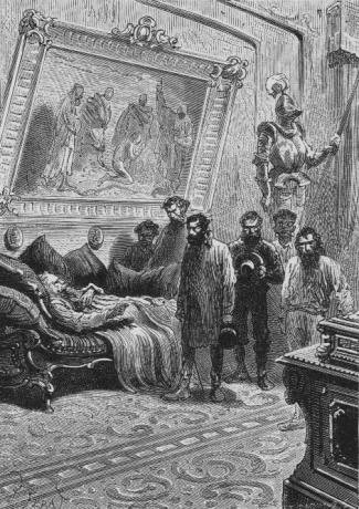 Cyrus Smith kaj liaj kunuloj alproksimiĝis al la sofo kaj alĝustigis la kusenojn por ke la mortanto havu pli bonan subtenon.