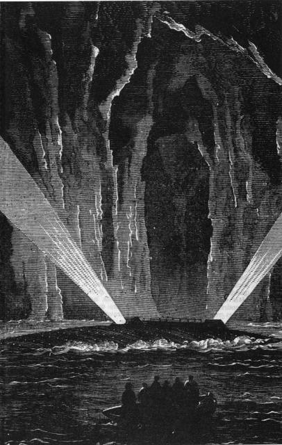 Dume tagiĝis. La plej eta lumradio ne penetriĝis al ĉi tiu profunda kaverno, kies enirejon tute inundis la maro. Sed la artefarita lumo, ŝprucanta en longaj faskoj el la muroj de la "Nautilus", ne malfortiĝis eĉ por momento, do la akvo ĉirkaŭanta la ŝipon daŭre brilis egale.