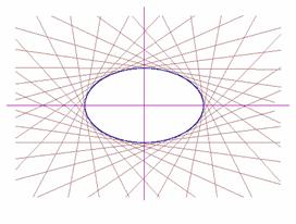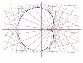 10 FOR t = -π TO π krok PSET (FNx(t),FNy(t)),kolor NEXT t 100 FOR t = -π TO π krok 110 x = FNx(t): y = FNy(t) 120 dt = .01 130 t = t+dt: x1 = FNx(t): y1 = FNy(t) 140 t = t+2*dt: x2 = FNx(t): y2 = FNy(t) 150 k = (y2-y1)/(x2-x1} 190 LINE (x-300,y+k*300)-(x+300,y+k*300),kolor NEXT t |