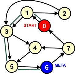 Osiągnęliśmy wierzchołek docelowy. Zatem istnieje w tym grafie ścieżka od wierzchołka 0 do 6. Algorytm DFS zawsze nam taką ścieżkę znajdzie. Nie gwarantuje on nam natomiast, że będzie to najkrótsza możliwa ścieżka. |