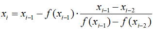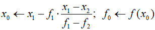 | x1, x2 | – | punkty krańcowe przedziału poszukiwań pierwiastka funkcji f(x). W dalszej fazie obliczeń punkty te przechowują dwie poprzednie wartości xo - x1 ostatnią, a x2 przedostatnią; x1, x2 ∈ R. |