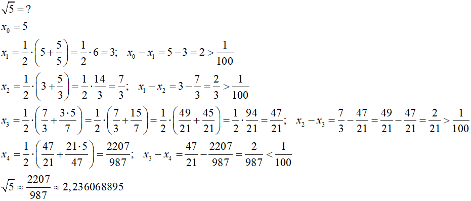 Kolejne przybliżenie otrzymamy podstawiając we wzorze za x0 obliczone x1. Wg tej metody postępujemy dotąd, aż różnica dwóch ostatnich przybliżeń będzie mniejsza od pożądanej dokładności wyznaczenia pierwiastka. Dla przykładu wyznaczmy tą metodą pierwiastek z liczby 5 z dokładnością do 0,01. Za punkt początkowy przyjmijmy 5.