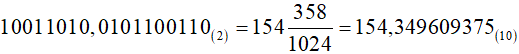 | 154,35(10)= 10011010,0101100110(2) |