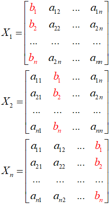 Oznaczmy przez Xi macierz, która powstaje z macierzy A przez zastąpienie wyrazów w kolumnie i-tej wyrazami wektora B: