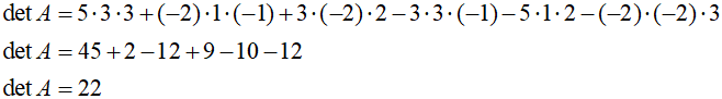 Obliczamy wyznacznik macierzy współczynników A. Wykorzystujemy schemat Saurrusa: