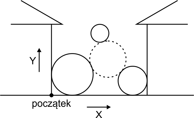 Dane dla twojego programu będą opisywały bieżące ułożenie rurociągów. Dla każdego rurociągu jeden wiersz danych poda współrzędne x i y środka rurociągu oraz jego promień jako trzy liczby rzeczywiste (w postaci: część całkowita, kropka dziesiętna i część ułamkowa) rozdzielone przynajmniej jedną spacją. Stąd będą trzy wiersze danych. Wszystkie wartości są podane w centymetrach. Początek układu współrzędnych jest umieszczony tak, jak pokazano na rysunku: na ziemi (oś x) i przy lewej ścianie (oś y).