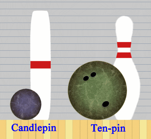 Kręgle Candlepin, chociaż używają tej samej liczby kręgli (10) i tej samej długości i szerokości parkietów co zwykłe kręgle Ten Pin, to jednak różnią się kształtem samych kręgli, co pokazuje obrazek powyżej. Kule są dużo mniejsze (mniej więcej o rozmiarze grapefruita) i dużo trudniej jest osiągnąć wysoką punktację niż w kręglach Ten Pin (kręglarze klasy mistrzowskiej w Ten Pin Bowling często mają średnio 210 punktów na grę, gdy natomiast kręglarze klasy mistrzowskiej w Candlepin Bowling zwykle mają średnio około 130 punktów na grę). Ta różnica może być szczególnie zaskakującą dla osób niezaznajomionych z tą grą, szczególnie że kręglarz Candlepin może wykonywać 3 rzuty kulą na ramkę, podczas gdy kręgle Ten Pin zezwalają tylko na dwa rzuty na ramkę.