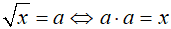 Pierwiastek kwadratowy z liczby x jest to taka liczba a, która pomnożona przez siebie daje liczbę x.