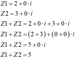 Zwróć uwagę, że jeśli części urojone są równe 0, to suma liczb zespolonych sprowadza się do sumy liczb rzeczywistych: