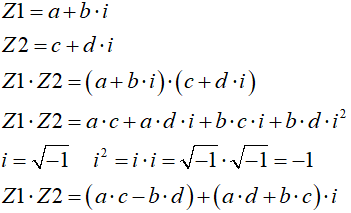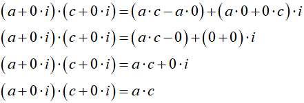 Gdy części urojone obu mnożonych liczb są równe 0, mnożenie liczb zespolonych sprowadza się do zwykłego mnożenia liczb rzeczywistych:
