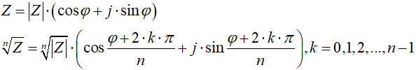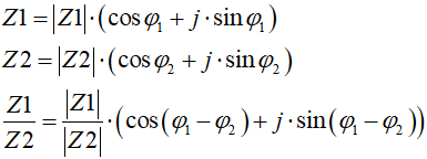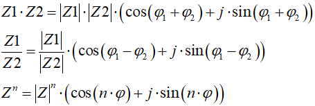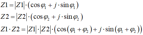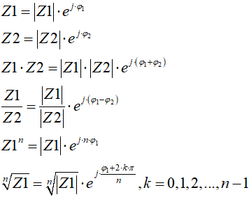 Sens wprowadzenia nowej postaci liczby zespolonej pojawia się wtedy, gdy mamy z tego jakąś korzyść. Otóż okazuje się, że w postaci trygonometrycznej dużo łatwiej wykonuje się mnożenie, dzielenie, potęgowanie i pierwiastkowanie liczb zespolonych. Aby nie zanudzać czytelnika wyprowadzaniem wzorów, podamy ich postać końcową (w elektrotechnice tradycyjnie kąt pomiędzy odcinkiem modułowym liczby zespolonej a osią rzeczywistą oznacza się literką grecką φ):