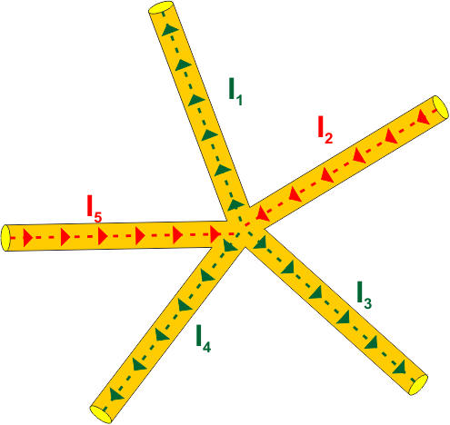 Załóżmy, że w pewnej sieci elektrycznej mamy węzeł, do którego podłączone jest 5 przewodów. Przewodami tymi płyną prądy. Prądy wpływające do węzła oznaczmy kolorem czerwonym. Prądy wypływające z węzła oznaczmy kolorem zielonym.