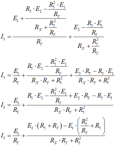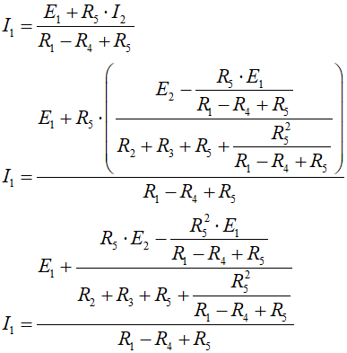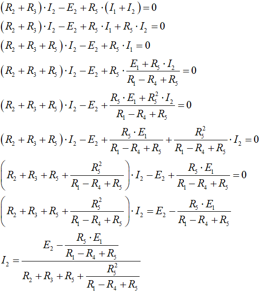 W równaniach są trzy niewiadome prądy: I1, I2 i I3. Z pierwszego równania wyznaczamy I3 i wstawiamy wynik do równania drugiego i trzeciego:
