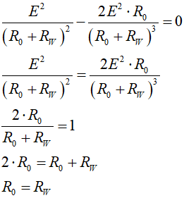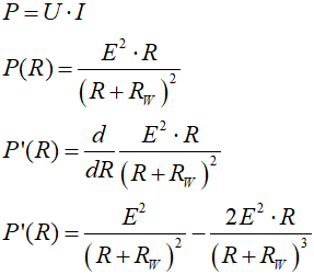 Znajdziemy maksimum mocy P w funkcji oporu R. Najpierw znajdujemy pierwszą pochodną: