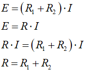 Otrzymaliśmy wynik: jeżeli zastąpimy oporniki R1 i R2 opornikiem R o oporności równej sumie tych oporników, to w obwodzie popłynie ten sam prąd. Zatem dla połączenia szeregowego oporników oporność zastępcza wyraża się wzorem: