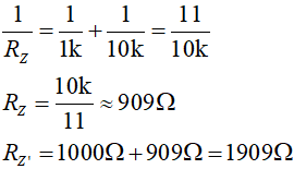 Mając prąd, wyznaczamy spadek napięcia na oporności zastępczej RZ. Spadek ten jest równy napięciu wyjściowemu z dzielnika przy obciążeniu 10k: