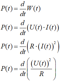 Podane powyżej wzory są prawdziwe dla mocy średniej lub przy stałym napięciu i stałym prądzie. Jeśli praca jest funkcją zmienną w czasie, to moc elektryczna jest pierwszą pochodną pracy po czasie: