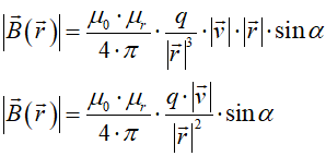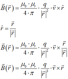 Wektor indukcji magnetycznej jest zawsze prostopadły do wektorów prędkości i położenia, co wynika bezpośrednio z iloczynu wektorowego. Wokół poruszającego się ładunku elektrycznego powstaje wirowe pole magnetyczne: dla stałego modułu r i kąta α pomiędzy wektorami prędkości i położenia moduł indukcji magnetycznej jest stały: