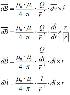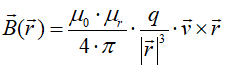 Określmy teraz pole magnetyczne, które wytwarza poruszający się w próżni ładunek elektryczny. Indukcję magnetyczną w punkcie P obliczamy ze wzoru: