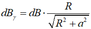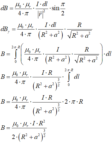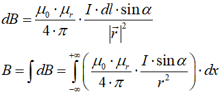 Wykorzystujemy prawo Biota-Savarta w postaci skalarnej (wektor położenia jest prostopadły do wektora długości, dlatego sinus kata pomiędzy nimi jest tutaj równy 1 i możemy go pominąć we wzorze) i piszemy:
