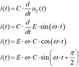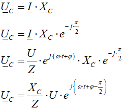 Napięcie na oporniku jest w fazie z prądem. Napięcie na kondensatorze otrzymamy mnożąc prąd przez opór pojemnościowy: