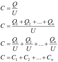 W połączeniu równoległym na kondensatory jest przyłożone to samo napięcie. Ładunek zgromadzony w tym układzie jest równy sumie ładunków kondensatorów: