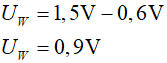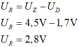 Skoro na diodzie w kierunku przewodzenia odłoży się spadek napięcia 1,7V, to reszta napięcia zasilającego musi odłożyć się na oporniku, czyli: