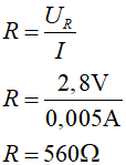 Diodę LED podłączamy zawsze z opornikiem ograniczającym prąd. Opornik dobieramy w zależności od napięcia zasilającego oraz od wymaganego prądu pracy diody LED. Na przykład, chcemy w obwodzie umieścić diodę LED świecącą kolorem czerwonym, przez którą ma płynąć prąd 5mA. Napięcie zasilające wynosi 4,5V. Jaki należy zastosować opornik?