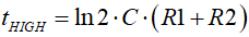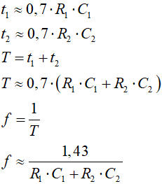 Na wyjściu powstaje ciąg impulsów prostokątnych. Czas trwania impulsu wynosi tHIGH. Czas przerwy pomiędzy impulsami wynosi tLOW. Czasy te nie są równe, ponieważ kondensator rozładowuje się poprzez R2, a ładuje poprzez R1 + R2, zatem czas przerwy jest krótszy od czasu impulsu. Aby uzyskać wypełnienie zbliżone do 50%, należy zastosować opornik R1 o oporności znacznie mniejszej od R2 – pamiętaj o ograniczeniach co do mocy opornika R1. Częstotliwość impulsów wyjściowych wynosi: