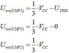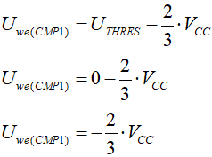 Włączamy zasilanie Vcc. Kondensator C jest jeszcze nienaładowany. Występuje na nim napięcie 0V, które przenosi się na wejścia TRIG i THRES. W takim stanie na wyjściu komparatora CMP1 jest stan 0, ponieważ jego wejściowe napięcie różnicowe jest ujemne: