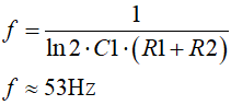 Musimy teraz obliczyć wartości oporników: R1, R2, R3 (potencjometr), R4 oraz kondensatorów C1 i C2. Generator ma produkować przebieg o częstotliwości około 50 Hz (okres 20 ms):