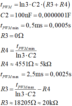 Teraz obliczamy parametry uniwibratora. Ma on generować impuls o minimalnym czasie trwania poniżej 1 ms, i maksymalnym czasie trwania powyżej 2 ms. Załóżmy, że zakres ten wynosi 0,5 ... 2,5 ms.