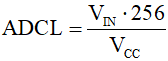 gdzie VIN jest napięciem na wybranej końcówce wejściowej, a VCC jest napięciem odniesienia. 0x00 reprezentuje napięcie o poziomie masy analogowej, natomiast 0xFF reprezentuje wybrane napięcie odniesienia minus jeden LSB (najmłodszy bit).