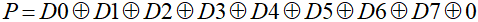 Bit parzystości jest obliczany z bitów danych za pomocą funkcji logicznej suma modulo dwa (ang. exclusive-or) zgodnie ze wzorem: