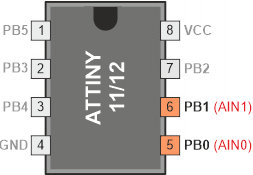 Komparator analogowy (ang. Analog Comparator) porównuje wartości napięć na wejściu nieodwracającym PB0 (AIN0) i na wejściu odwracającym PB1 (AIN1).