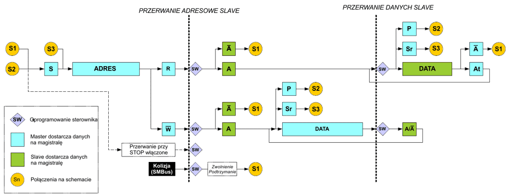 Gdy zostanie ustawiony znacznik przerwania, na linii SCL zostaje wymuszony stan niski. Daje to czas układowi slave na odpowiedź lub przetworzenie danych, co w większości przypadków będzie wymagało współdziałania ze strony programu. Poniższy rysunek pokazuje działanie układu slave TWI. Romby SW oznaczają miejsca, w których wymagana jest współpraca z oprogramowaniem.
