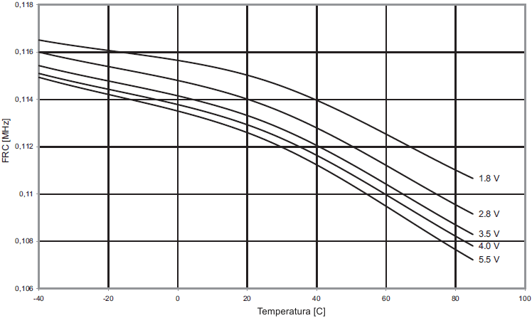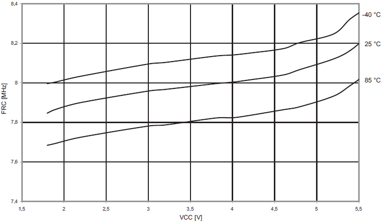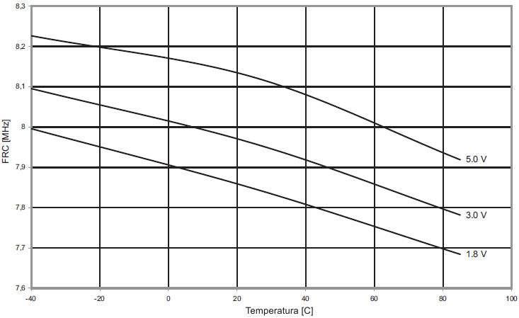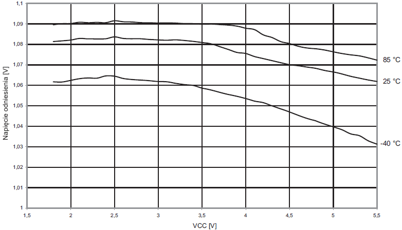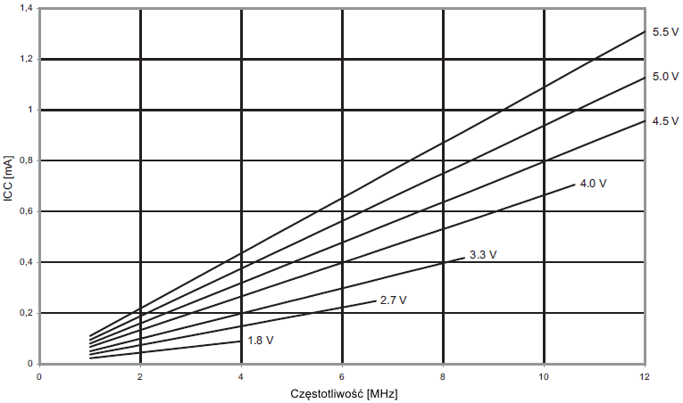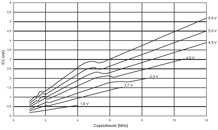 Kolejne wykresy pokazują typowe zachowanie się układu. Parametry te nie są testowane podczas produkcji, gdzie testy wykonywane są z częstotliwościami wykraczającymi poza normalne granice, co nie oznacza, iż w normalnych warunkach pracy mikrokontroler również będzie pracował właściwie przy takich częstotliwościach.
