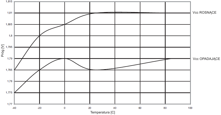 Próg BOD w funkcji temperatury (BODLEVEL wynosi 1,8V)
